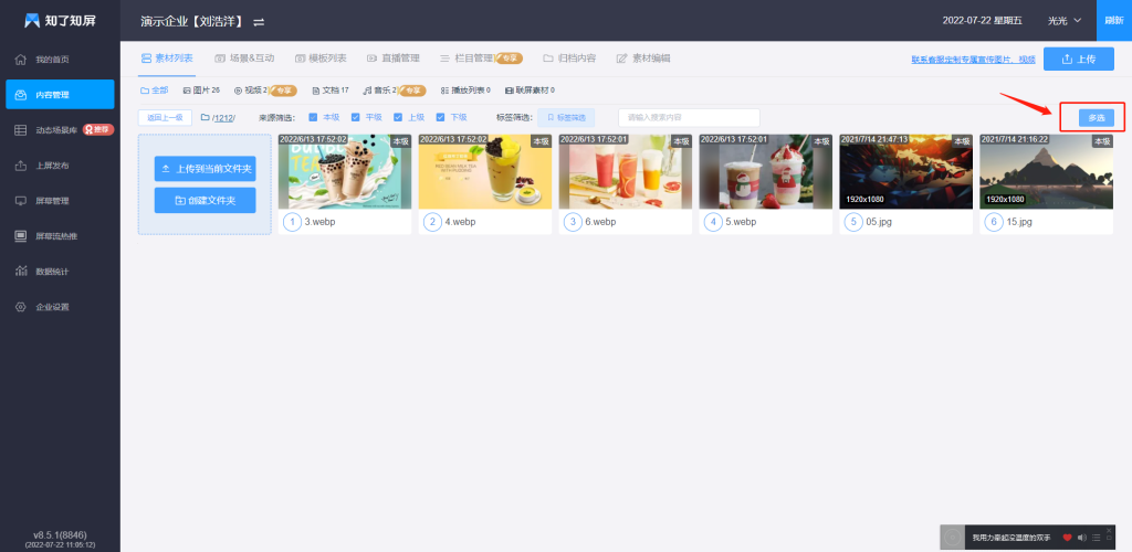 进入内容管理界面,点击右上角“多选”按钮 – 勾选循环播放的素材内容