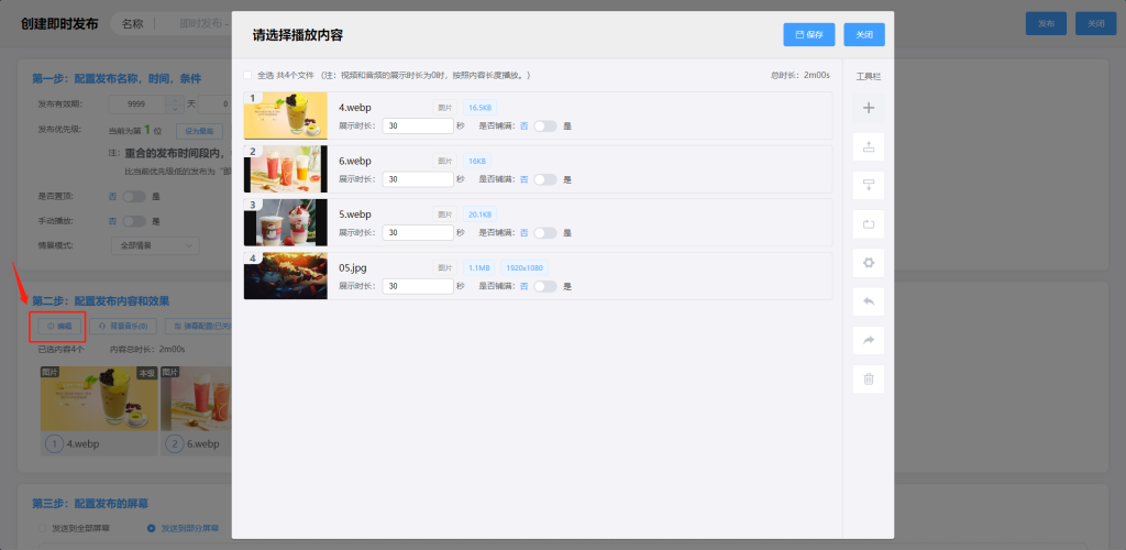 进入发布设置 — 配置发布内容和效果 — 编辑,可调整图片/PPT素材展示时间,勾选需要发布的终端屏幕,完成发布。