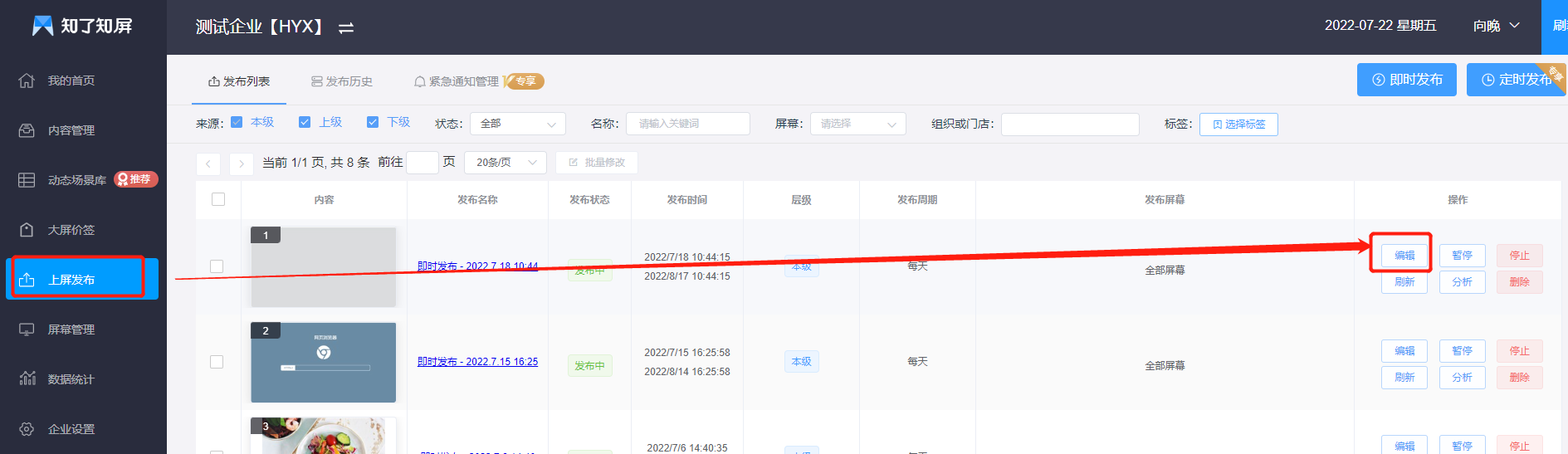在【上屏发布】-【发布列表】找到最新的一条发布,点击编辑;