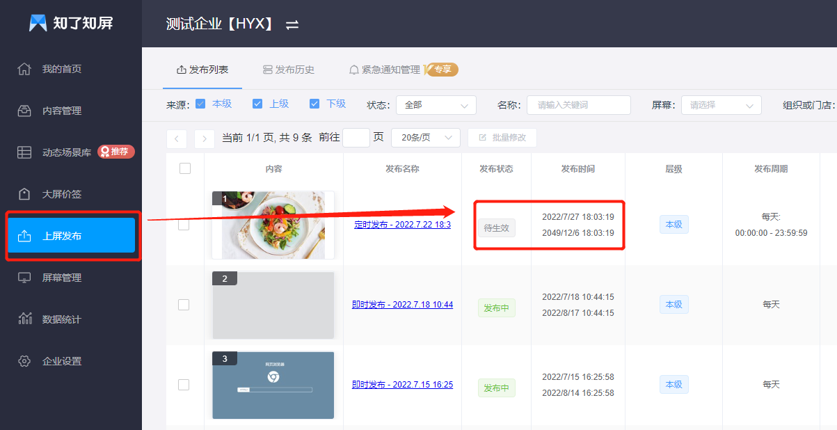 PC端:在【发布管理】-【发布列表】页面,可以看到定时发布的生效时间,如图:
