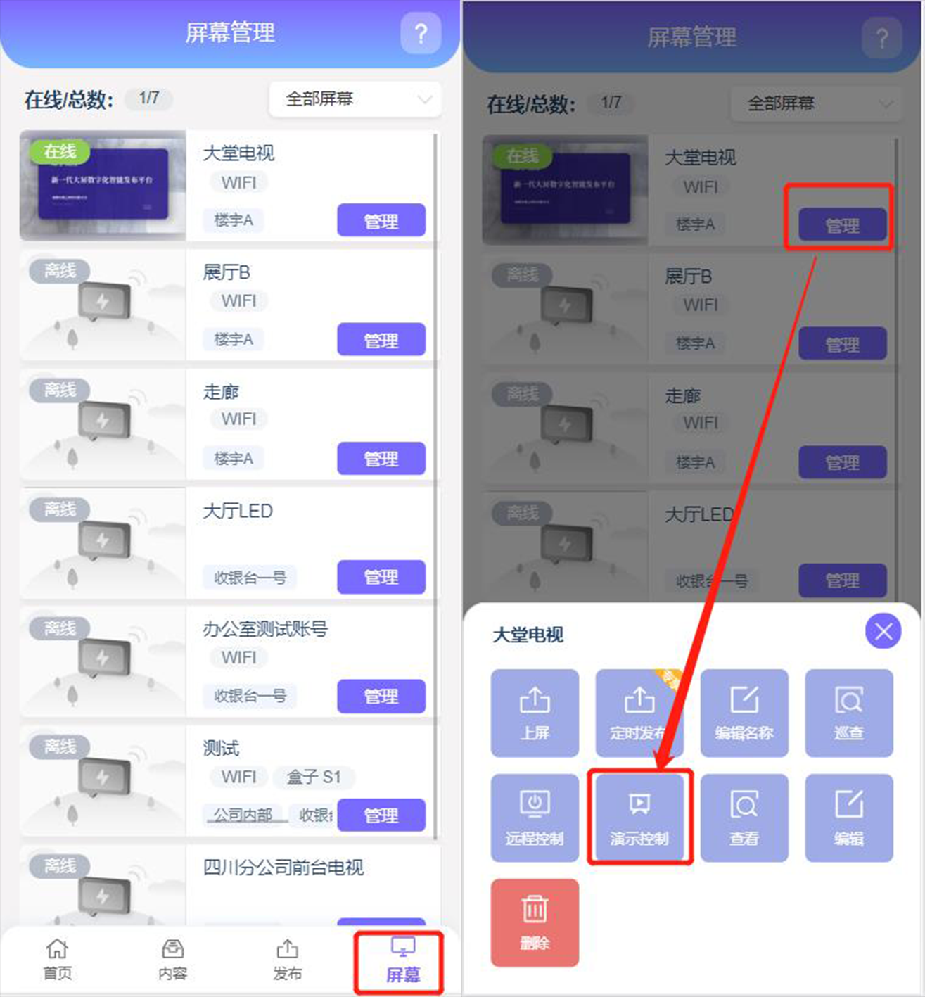 2.打开移动端,点击【屏幕】,选择要演示的屏幕,点击【管理】,出现操作弹窗,点击【演示控制】。